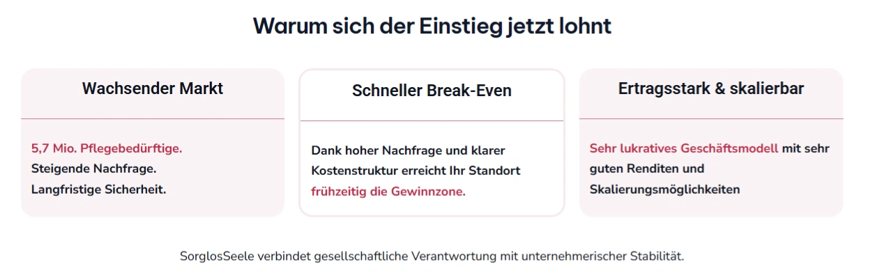 SorglosSeele ist ein Franchisesystem mit einem skalierbaren Geschäftsmodell im wachsenden Markt der Seniorenbetreuung. Das Konzept verbindet gesellschaftliche Verantwortung mit unternehmerischer Perspektive.