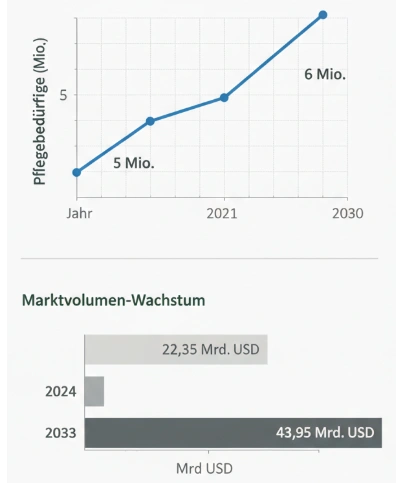 - Wachstumsmarkt: Deutschland altert – bis 2035 wird jede dritte Person über 60 sein. Das Konzept eröffnet Chancen in einem stark wachsenden Markt für Seniorenbetreuung mit vorpflegerischen Leistungen.